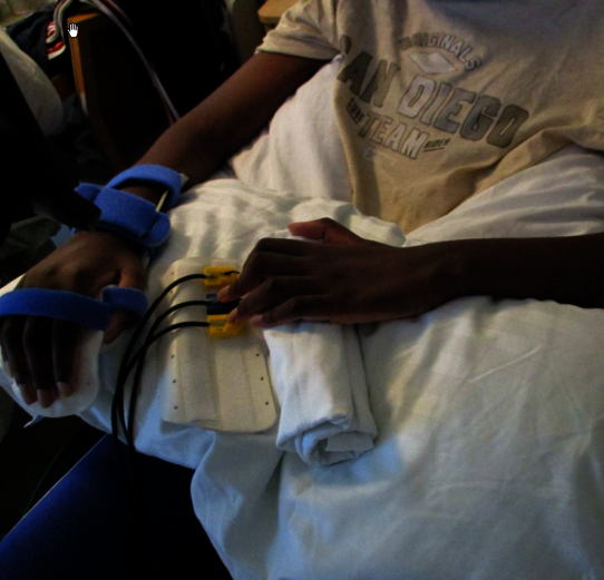 Durch Ergotherapie konnten im Laufe der Zeit Verbesserungen der Motorik der linken Hand erzielt werden, es war Richie nun möglich, einzelne Finger gezielt anzusteuern und dadurch etwas zu bewegen. Die Bewegung war stark genug, um besonders leichtgängige Taster, die wir entsprechend montierten und über ein FABI System mit dem Computer verbinden konnten. Diese Taster ersetzten nun den einzelnen größeren Button.