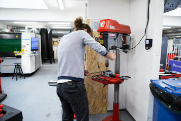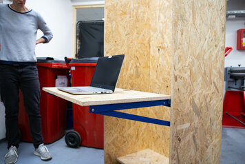 Der Korpus aus Holz, bisher als Stehtisch im HappyLab in Verwendung, war bereits vorhanden. Die bestehende Abstellfläche wurde abgeschraubt und mit Metallleisten, die mit einer Metallbandsäge zugeschnitten wurden, wieder in den Korpus geschraubt. Somit entstand ein Klappmechanismus. Zusätzlich wurden die Leisten in der gewohnten HappyLab Farbe Blau lackiert. Auf die Hinterseite des Korpus wurde ein Magnet geklebt, sodass die Abstellfläche im geschlossenen Zustand fixiert werden kann. Die Abstellfläche kann nun sowohl auf eine genormte Rollstuhlhöhe herausgeklappt werden als auch als Stehtisch verwendet werden.