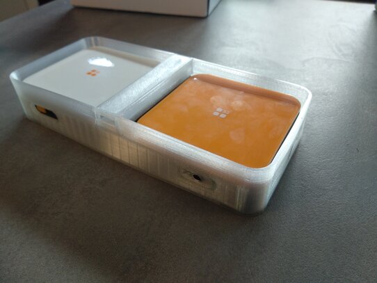 "Gibt es für den Taster auch eine Art Schutzhülle, oder eine Art Halterung? - etwas, das dem Taster ein bisschen mehr Stabilität verleiht und ihm eine Umrandung gibt, damit das blinde Kind eine zusätzliche Orientierungshilfe hat und die Knöpfe auf den Seiten vom unabsichtlichen Drücken schützt (er drückt schon gerne herum, eine Tastensperre gibt es aber leider nicht!) "