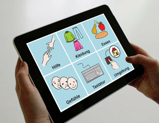 - Symbolbasierte Kommunikation: Hierbei können Symbole mit Wörtern oder Sätzen verknüpft werden. Bei Auswahl der Elemente kann der entsprechende Text von einer Computerstimme ausgesprochen werden (Abbildung 1).